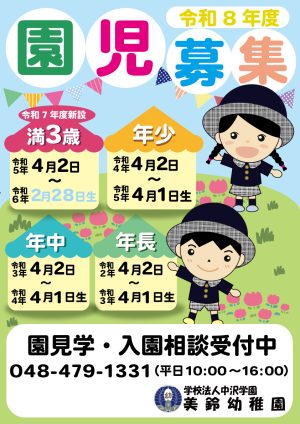 ※卒園弟妹の方で、願書希望の方は、10月14日(火)までに、美鈴幼稚園(048-479-1331)にお申し出ください。